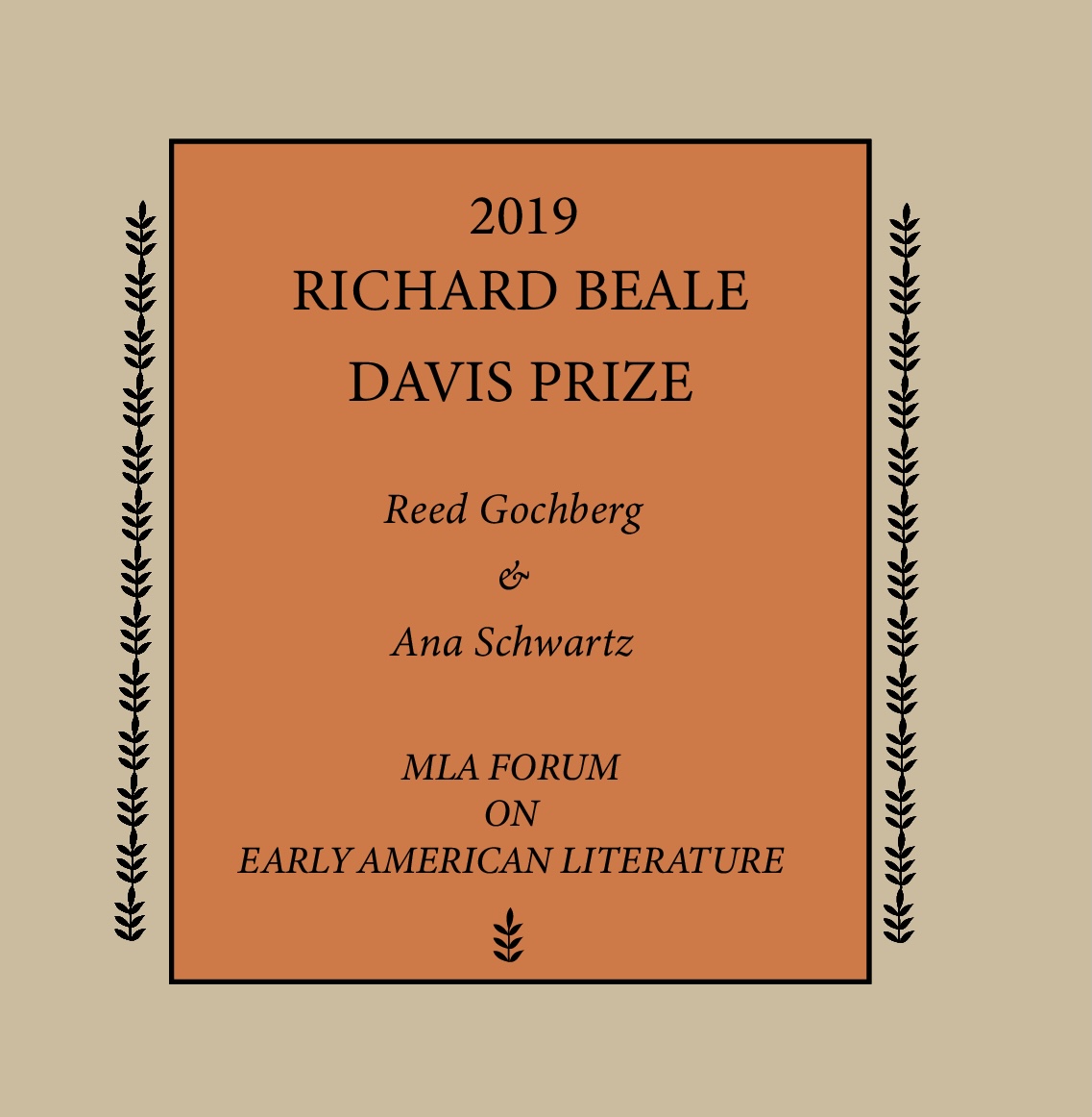 The prize committee is pleased to name Reed Gochberg’s “Circulating Objects: Crevecoeur's ‘Curious Book’ and the American Philosophical Society Cabinet” and Ana Schwartz’s “‘Mercy as Well as Extremity’: Forts, Fences, and Fellow Feeling in New England Settlement” as co-winners of the 2019 Richard Beale Davis prize for the best essay published in Early American Literature. While the committee considered many worthy contributions to the journal, these essays were distinguished by their virtuoso interpretations of key texts as well as their ambitious reimagining of the field.